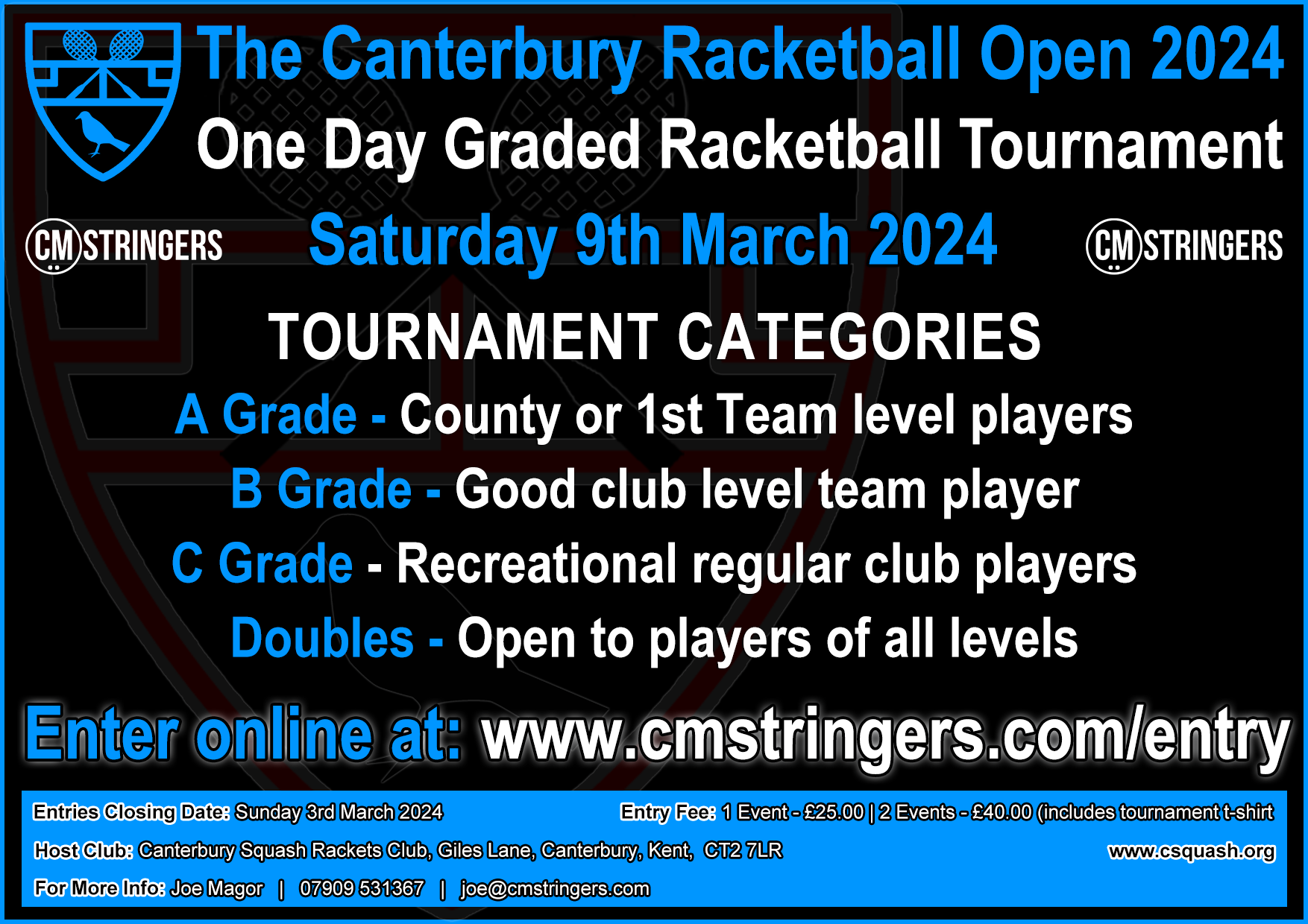 • Entry Fee includes The Canterbury Racketball Open 2024 tournament t-shirt.