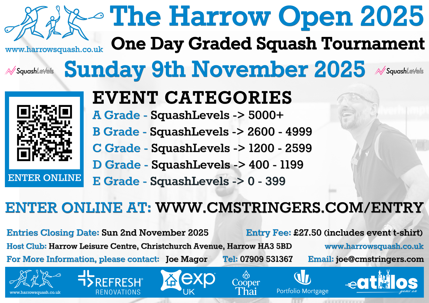 • Entry Fee includes a Harrow Open 2025 tournament t-shirt.